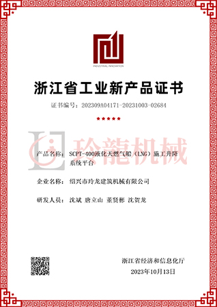SCPT-400液化天燃?xì)獯↙NG)施工升降系統(tǒng)平臺(tái)新產(chǎn)品評(píng)價(jià)證書